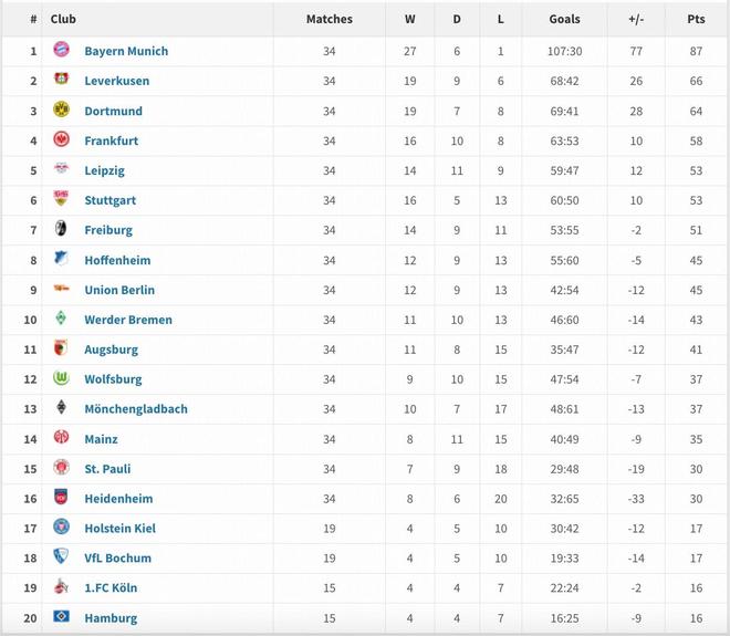 拜仁聯(lián)賽唯一一負(fù)發(fā)生在今年3月,他們?cè)谥鲌?chǎng)2-3爆冷不敵波鴻。拜仁在34場(chǎng)比賽里拿到了87分,比第二名的勒沃庫森多了21分。